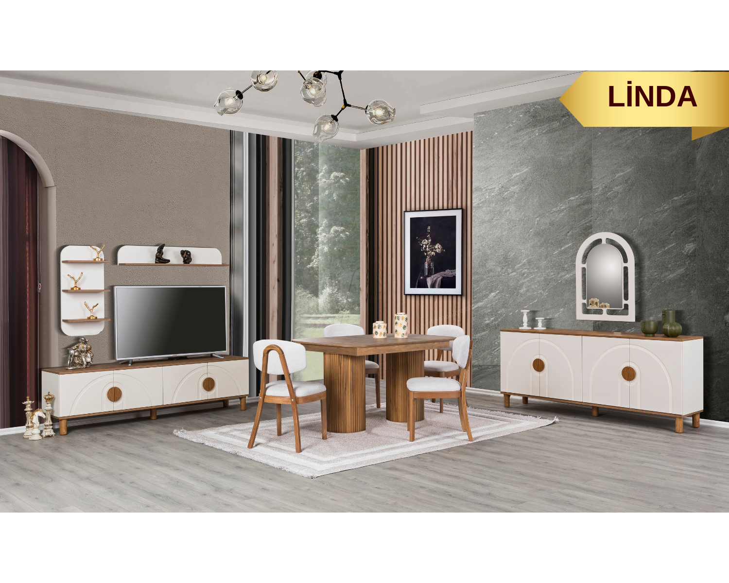 - Yemek Odası İçeriği: Yemek odası takımında TV sehpası, konsol, açılır veya sabit olarak tercih edilebilecek masa bulunuyor. Dolap, konsol, TV sehpası ve komodin gibi parçaların kapaklarında kullanılan membran malzeme, uzun ömürlü ve dayanıklı bir yapı sunuyor.